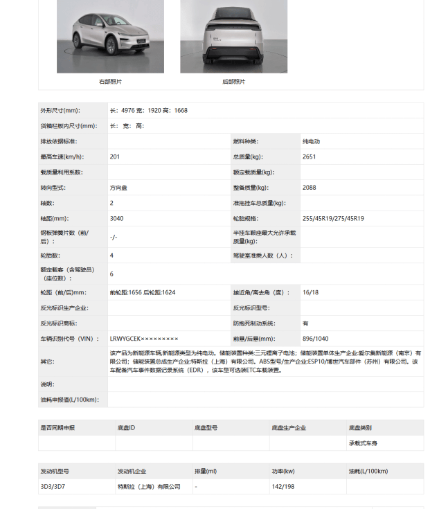 基礎參數: Model Y L 4976mm車長+3040mm軸距,塞進6個座位,軸距甚至比Model X還長7.5cm,雙電機(142kW+198kW)。