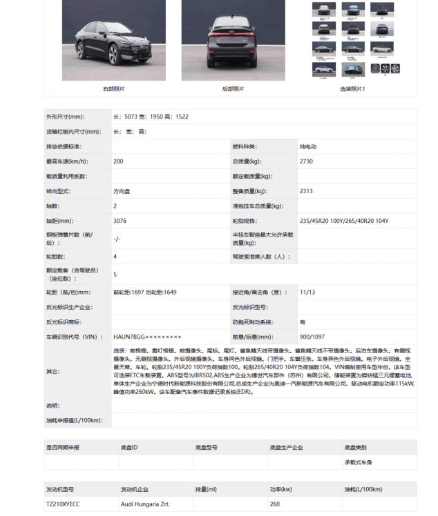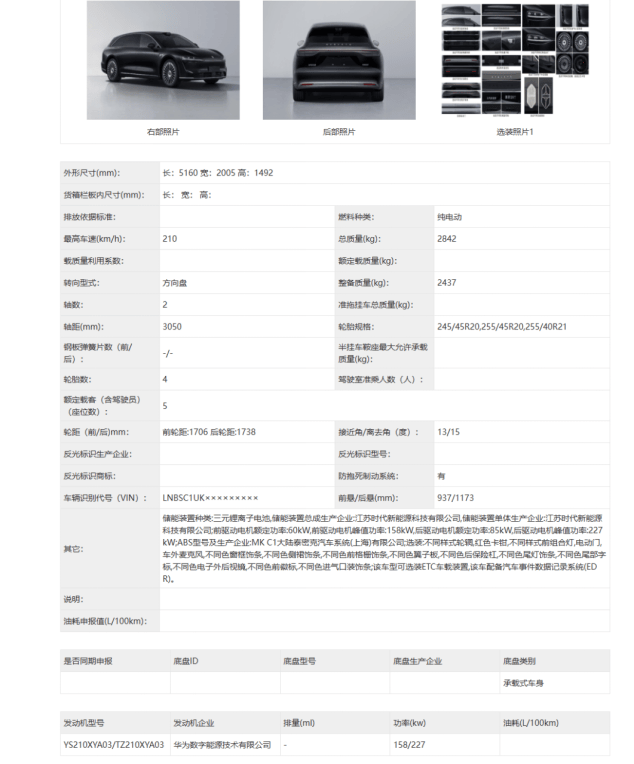 長寬高5073/1942/1522mm,軸距3076mm,寧德電池+800V高壓平臺,快充10分鐘補能310km,單電機后驅260kW。
