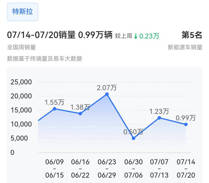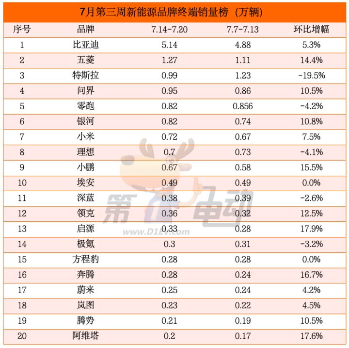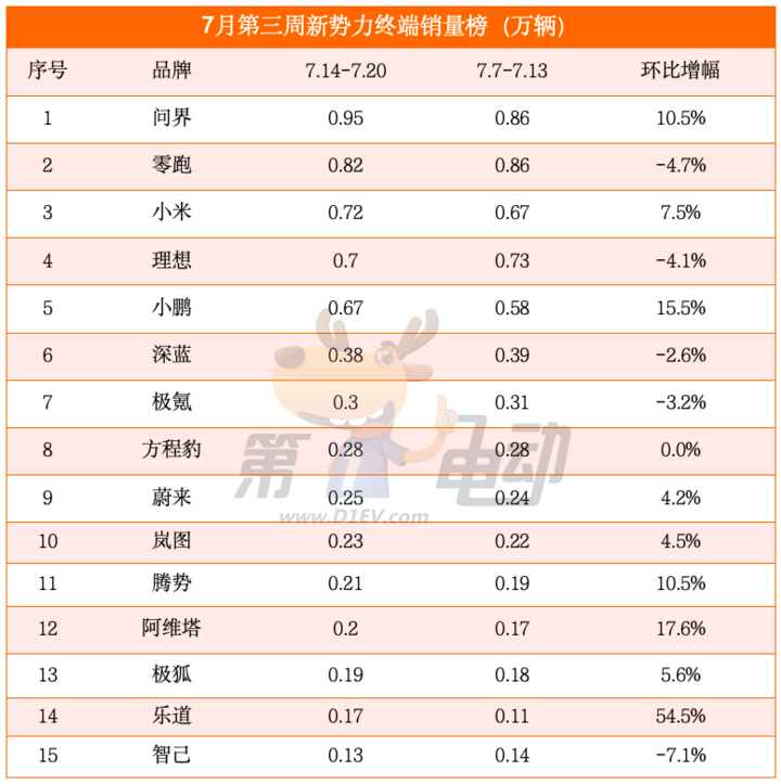 不過,特斯拉的表現出現明顯波動,繼第二周銷量暴漲后,7月第三周銷量環比大幅下降近20%,排名也隨之滑落至第三。除特斯拉外,理想、零跑、深藍、極氪等品牌的周銷量也出現下滑,其中理想周銷量下滑4%,被小米反超,排名降至第八。