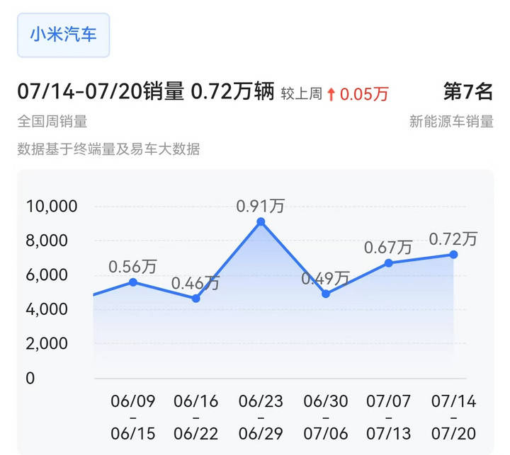 小米周銷量環比上漲7.5%,再次超越理想進入前三。旗下備受關注的小米YU7周交付量達900輛,正快速交付中。