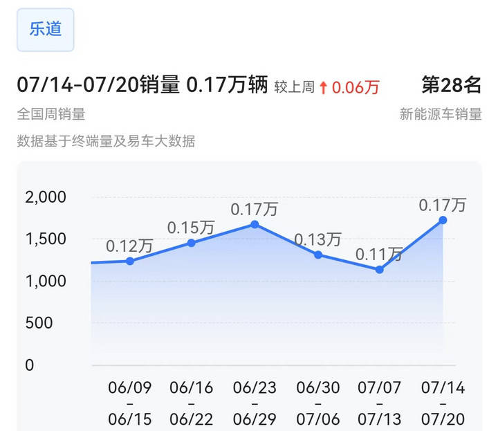 第三梯隊的樂道、騰勢、阿維塔正奮力追趕,周銷量環比均實現超10%的大漲。其中,“大降價”的樂道周銷量環比大漲超55%,超越智己位居第14。