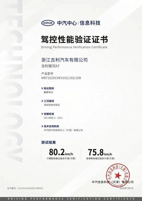 在調校層面,路特斯頂尖技術團隊的深度參與為銀河A7帶來了卓越的操控表現。團隊傾注大量心血,結合AI數字化調校技術,對車輛進行了全面而精準的調校。這種調校覆蓋了全球200多種細分路況,包括多個試驗場、城市道路、高速公路、鄉村山路、越野路段以及雨雪、沙地等各種用戶可能遇到的場景,確保車輛在全場景下都能兼具出色的操控性和乘坐舒適性。得益于這樣的調校,銀河A7整車重心更低,搭配更輕的鋁質轉向節,帶來了更穩定的底盤操控和更迅捷的動態響應能力。其麋鹿測試成績達到80.2公里/小時,并獲得了《中汽中心駕控性能驗證證書》,充分印證了車輛在緊急情況下的車身穩定性和避險能力。不僅如此,銀河A7的轉向表現也十分亮眼,即便擁有同級最長的2845mm軸距,轉彎半徑卻僅為5.3米,比同級車型更短,這讓它在日常城市通勤中更加便捷,窄路掉頭也變得輕松自如。