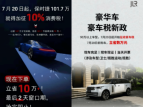 7月17日,財政部與國家稅務總局聯合發布公告,將超豪華小汽車消費稅起征點從130萬元大幅下調至90萬元,新政覆蓋所有動力類型,包括此前免稅的純電動和燃料電池車。這一政策于7月20日正式生效。