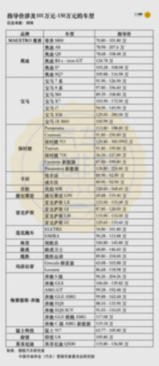搜狐汽車整理了指導價在101萬元-150萬元之間的車型發現,其中,奧迪、寶馬、保時捷、、奔馳涉及的車型最多,分別為5款、7款、7款、4款、8款。