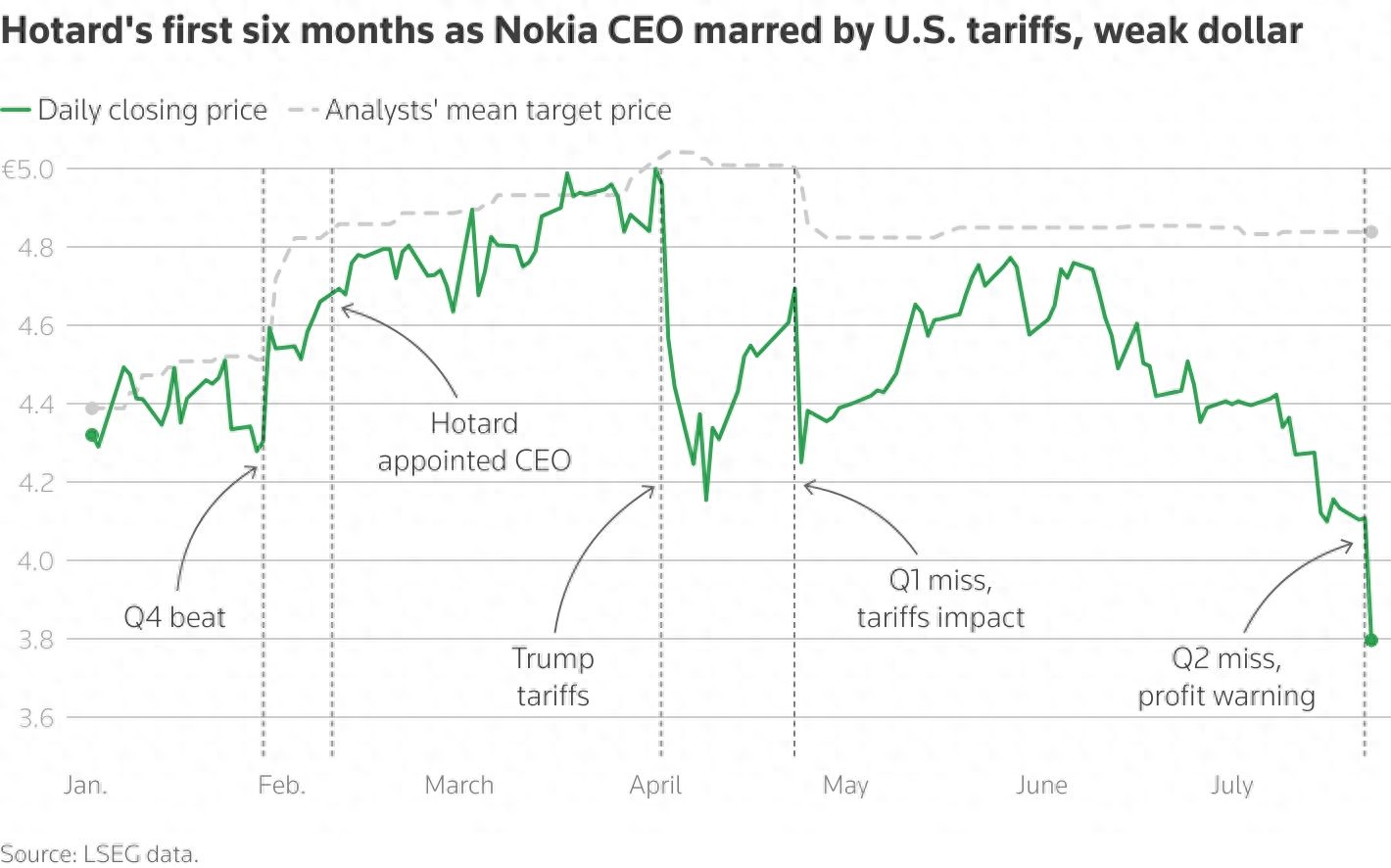 諾基亞本周早些時候表示,貨幣貶值導致公司今年的利潤減少約 2.3 億歐元,而關稅將帶來另外 5000 萬至 8000 萬歐元的打擊。公司還表示,其二季度投資組合遭受了 5000 萬歐元的非現金減值,這是受匯率波動影響。