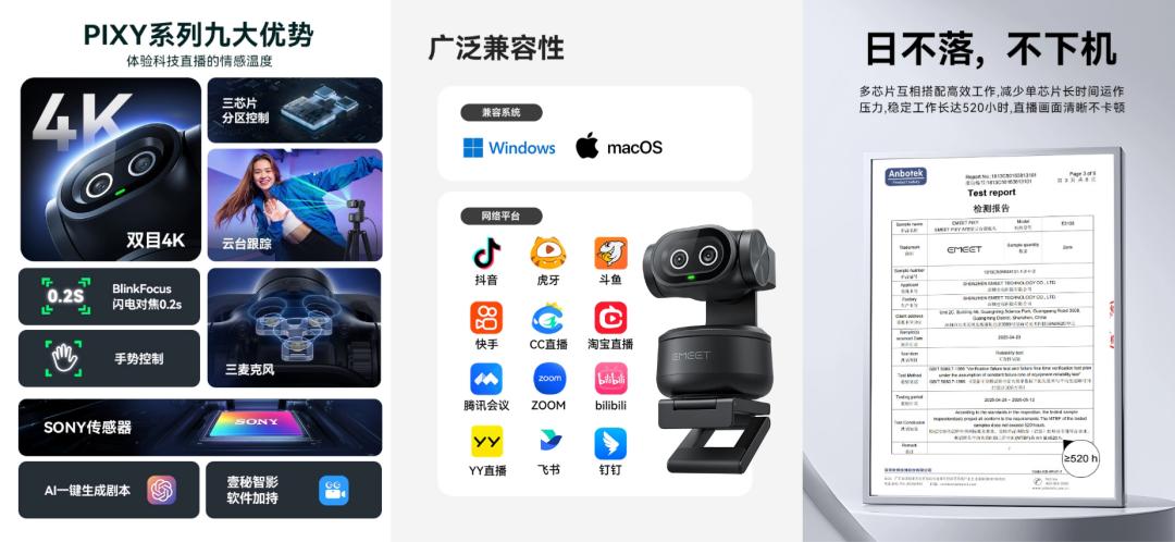 1、核心設(shè)備:直播攝像頭(EMEET PIXY 4K 超清雙目 AI 智能云臺攝像頭)、麥克風(fēng)(大疆DJI Mic2)、三腳架(EMEET落地三腳架FTD603)、補(bǔ)光燈(Godox神牛 SL150W)、電腦(CPU英特爾酷睿i5 8代系列及以上;顯卡NVIDIA GeForCe RTX 1660及以上)