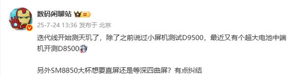 7月24日,數(shù)碼閑聊站透露,某手機(jī)廠(chǎng)商已經(jīng)開(kāi)始測(cè)試搭載聯(lián)發(fā)科天璣9500處理器的旗艦級(jí)小屏機(jī)型和一款搭載聯(lián)發(fā)科天璣8500處理器+超大電池的中端機(jī)型。