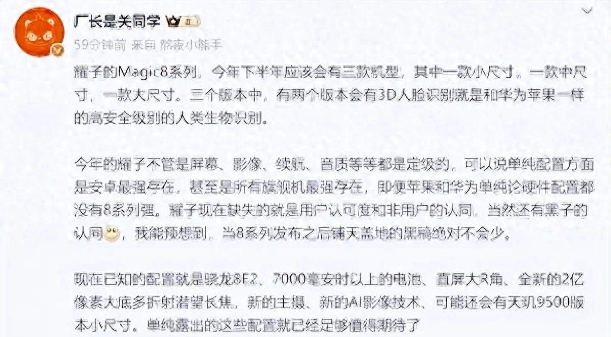 最近網(wǎng)上有消息說榮耀要發(fā)新手機(jī),叫Magic8系列。主要參數(shù)挺嚇人,主攝傳感器有1英寸那么大,長焦鏡頭能拍2億像素,還裝了7000毫安的大電池。這些配置要是真落實,明年安卓陣營的競爭應(yīng)該會更激烈。