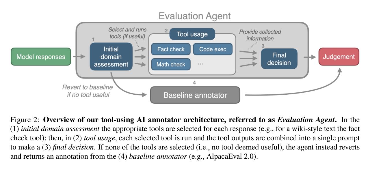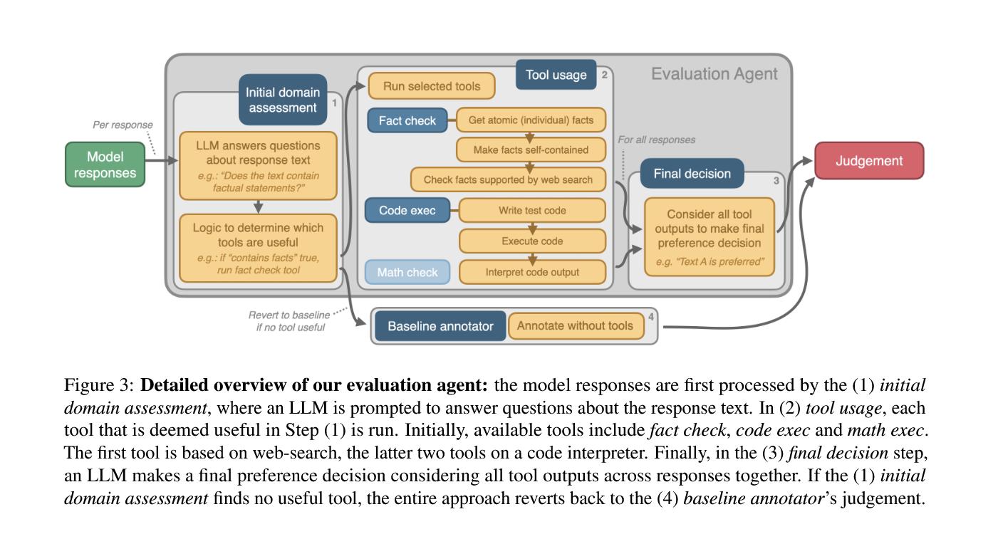 研究人員創建的評估代理是具有自主性的,它能夠評估響應以確定是否需要外部工具,并使用正確的工具。每個評估都經過三個主要步驟:初始領域評估、工具使用和最終決策。