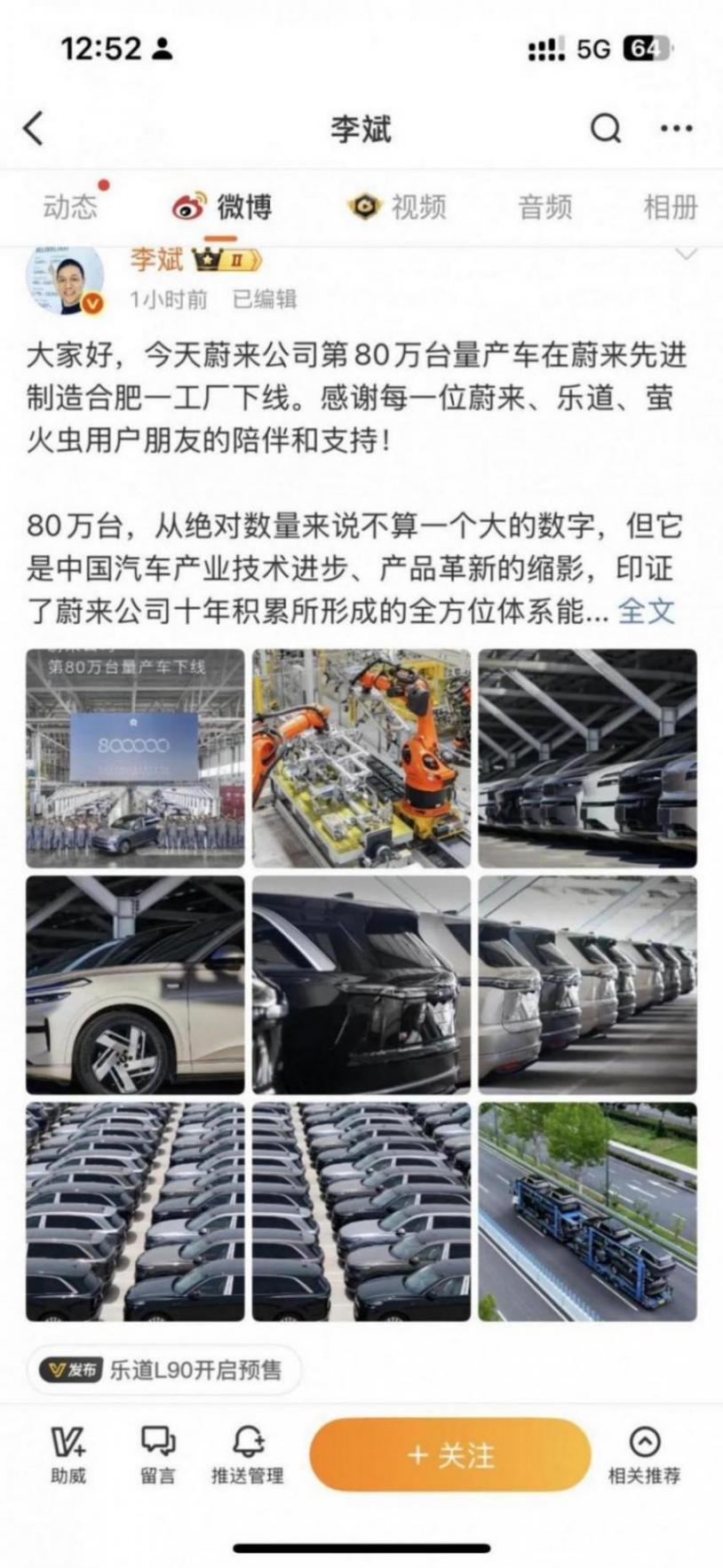 蔚來官方宣布,品牌第 80 萬輛量產車下線,而品牌第80萬臺車,正是目前備受矚目的樂道L90。