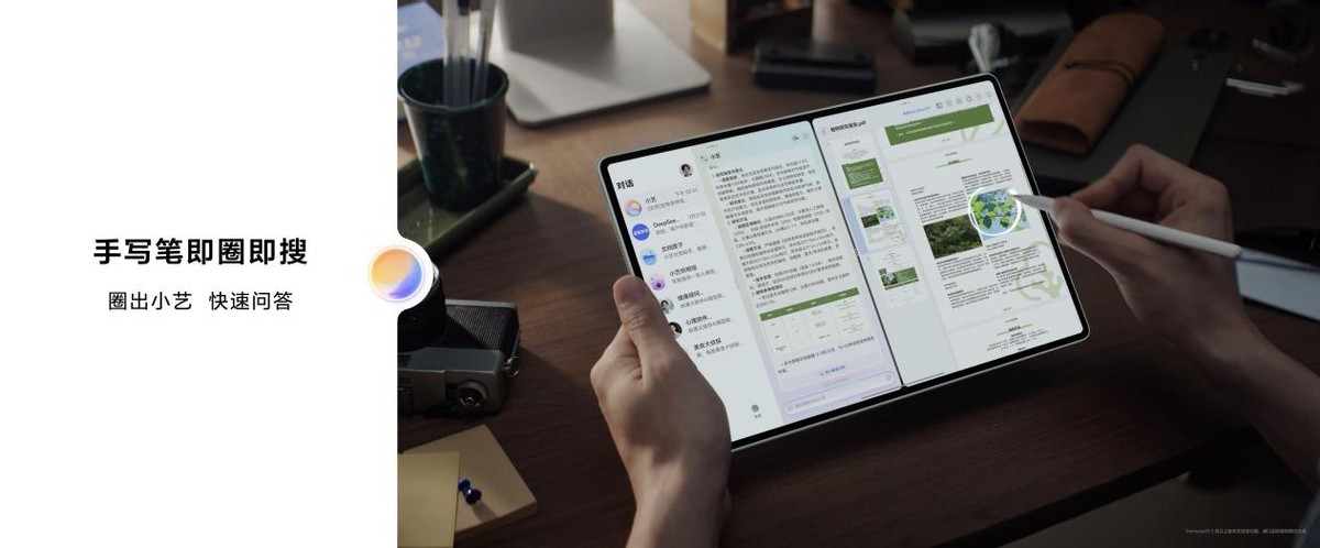 這種智慧能力同樣體現(xiàn)在全新手寫筆HUAWEI M-Pencil Pro上,這支手寫筆首次新增AI功能快捷入口,筆尾的智慧按鍵單擊可喚醒小藝,雙擊則能開啟語音轉(zhuǎn)文字功能,在會議或靈感突現(xiàn)時(shí)能即刻記錄。配合全新的輕捏筆身手勢,彈出全局波輪啟動小藝圈選,直接圈選屏幕內(nèi)容進(jìn)行搜索,快速實(shí)現(xiàn)“即圈即搜”,讓信息檢索的效率大幅提升。