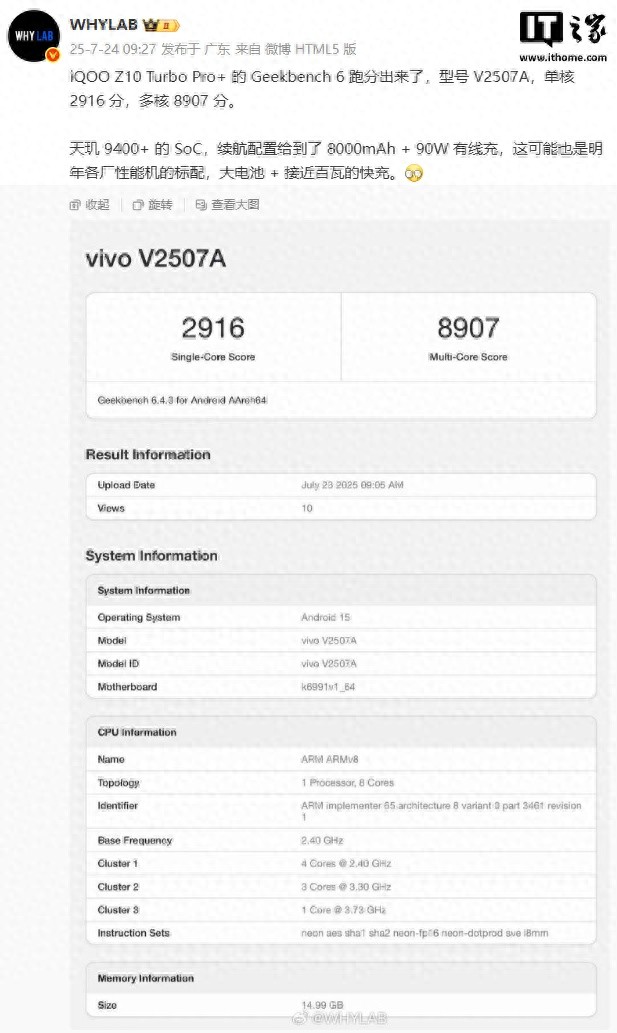 7 月 24 日消息,一款型號為 V2507A 的 vivo 新機(jī)昨日現(xiàn)身 Geekbench 跑分平臺,博主 @WHYLAB 透露該機(jī)為 iQOO Z10 Turbo Pro+。