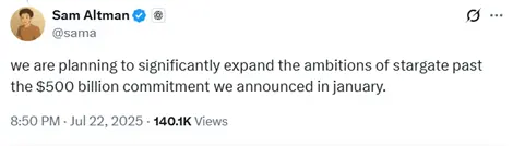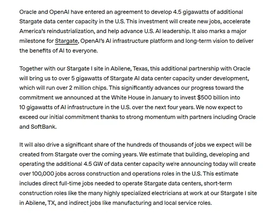 昨晚,OpenAI首席執行官Sam Altman宣布,已與甲骨文(Oracle)簽署合作協議,擴大5000億美元投資Stargate項目,將額外增加4.5吉瓦的容量。