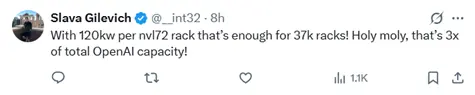 按照每個NVL72機架 120 千瓦的功率計算,這足以支撐3.7萬個機架!我的天,這相當于OpenAI 現有總容量的3倍啊!
