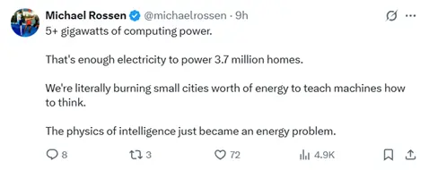 5吉瓦以上的計算能力。這足以供 370 萬戶家庭用電。我們簡直是在消耗相當于小型城市的能源,來教機器如何思考。智能的物理層面已經變成了一個能源問題。