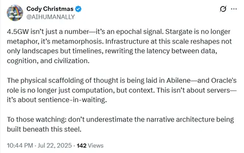 4.5 吉瓦不只是一個數字,這是一個劃時代的信號。Stargate不再是隱喻,而是一場蛻變。這種規模的基礎設施不僅重塑地貌,更改寫時間線,重新定義數據、認知與文明之間的延遲。