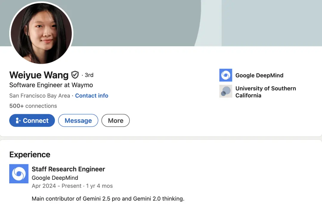 王薇月任谷歌DeepMind主任研究工程師,是Gemini 2.5 pro和Gemini 2.0 thinking的主要貢獻者。