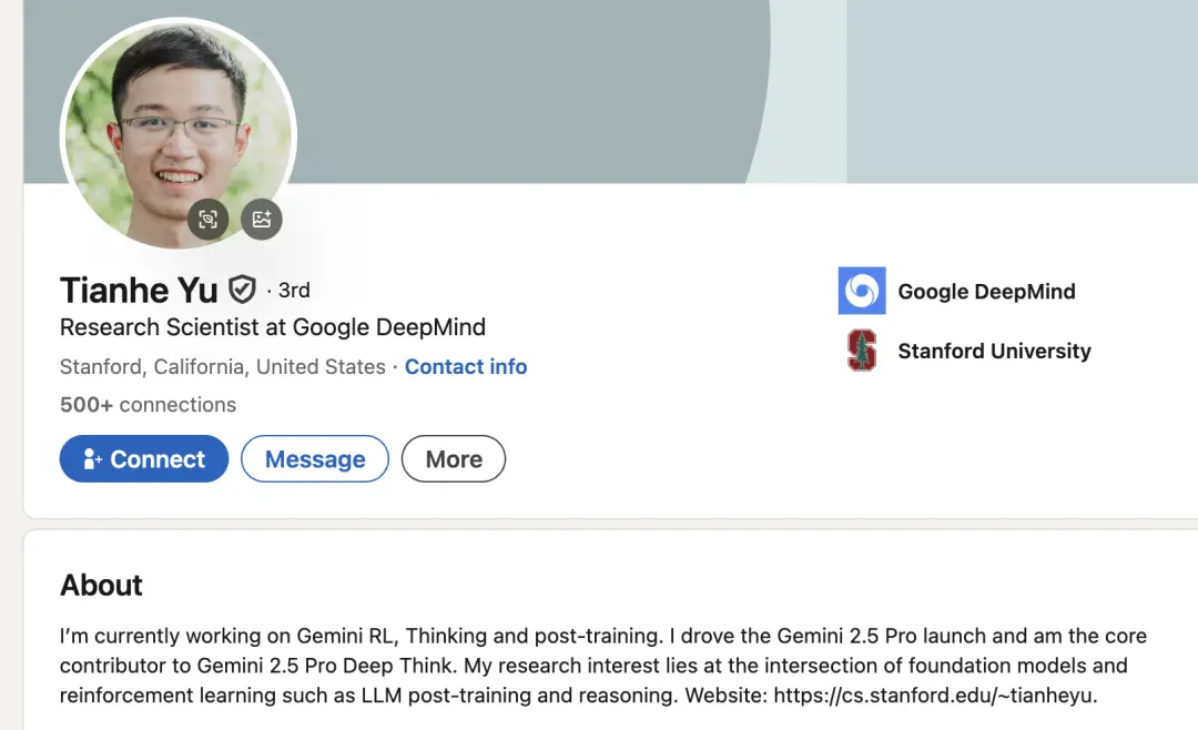 Tianhe Yu任谷歌DeepMind的研究科學家,負責Gemini的強化學習、思考和后訓練,還推動了Gemini 2.5的發(fā)布,是Gemini 2.5 Pro深度思考的核心貢獻者。