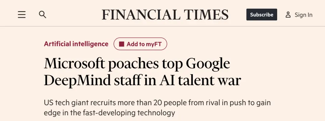微軟對谷歌的挖角行動從6個月前已經(jīng)開始,由微軟AI的CEO Mustafa Suleyman負責,Suleyman本就是DeepMind聯(lián)合創(chuàng)始人,現(xiàn)在負責從老搭檔Hassabis手上挖人,給這件事增加了更多戲劇色彩。