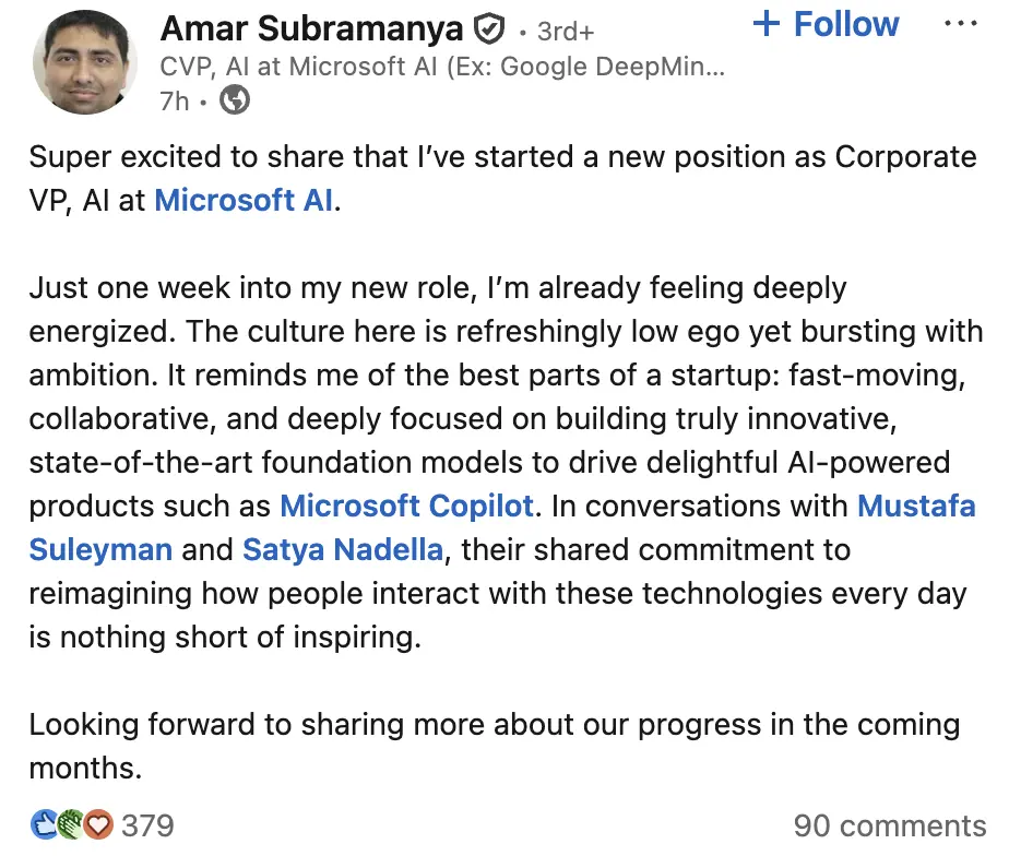 Gemini前工程主管Amar Subramanya加入Microsoft AI任副總裁,他表示微軟的企業(yè)文化令人耳目一新。