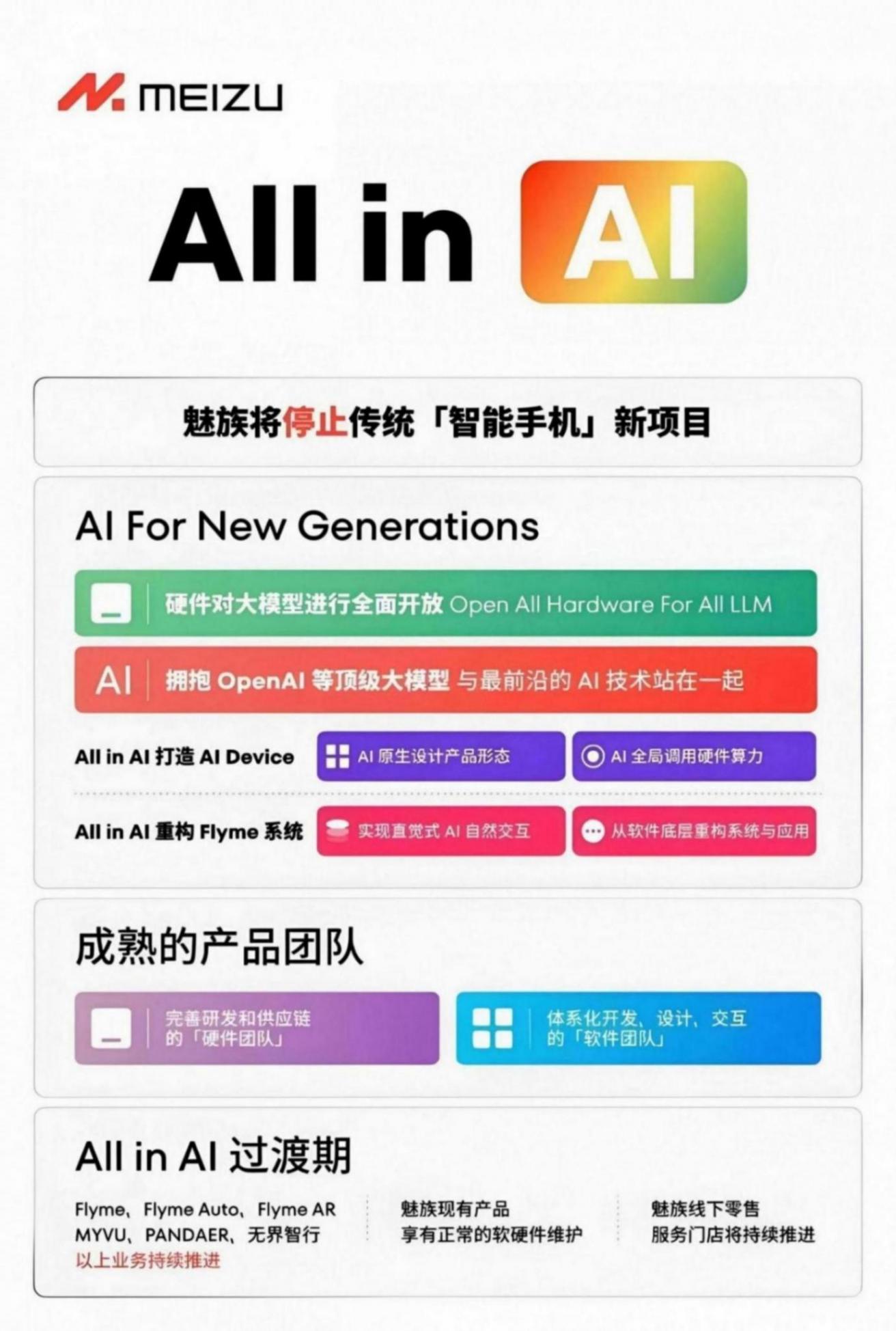 早在2023年,時任星紀魅族CEO沈子瑜公開表示,魅族不再發布傳統手機產品,只會發布“AI終端”。但魅族此后發布的多款手機認證信息都是“手機”,官方宣傳和媒體介紹也都是“手機”,此后宣傳一直都模糊了兩者概念,不再強調“AI終端”。