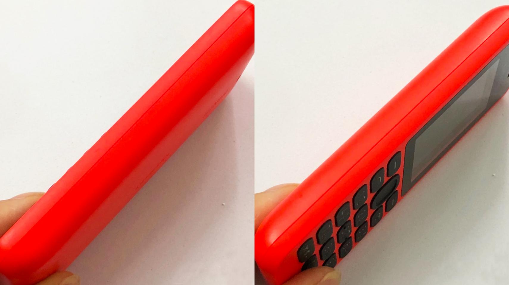 熟悉的聚碳酸酯多彩后殼。來到機身后蓋,小編拿到手的是一臺紅色版本,所以后蓋是完整的紅色,包括機身正面的按鍵以下底殼也是紅色。整體而言,130的紅色版本是紅色加黑色的組合,紅色是底殼色,黑色絲按鍵、電池艙蓋固定底板的顏色。材料上,130的底殼全部是聚碳酸酯,也是由諾基亞提倡并發揚光大的手機外殼制作材料,它輕薄有韌性,可以輕松疊加顏色,很快被普及開來。為此,130做到了13.9mm厚度與67.9克重量,十分纖薄。