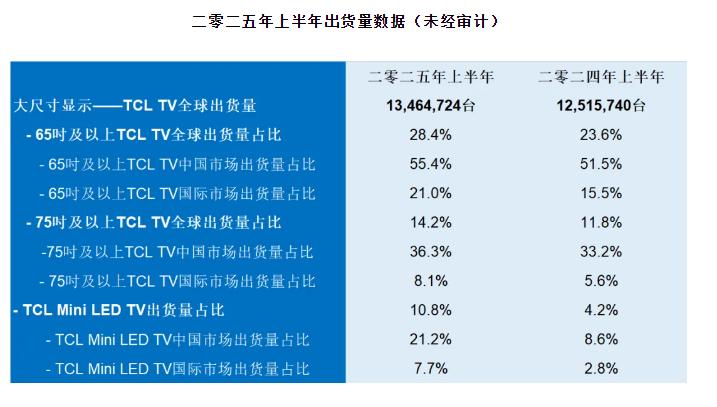 TCL全球出貨量穩(wěn)居第二的成績,絕非簡單的"量的積累",而是一幅"高端化+大屏化+全球化"相互交織的立體增長圖景。2025年上半年,其產(chǎn)品結(jié)構(gòu)優(yōu)化呈現(xiàn)出鮮明的"大尺寸、高價值"特征:65吋及以上全球出貨量同比增長29.7%,占比提升4.8個百分點至28.4%;75吋及以上同比增幅同樣達(dá)29.7%,占比提升2.4個百分點至14.2%;全球出貨平均尺寸同比增加1.5吋至53.4吋。這種結(jié)構(gòu)性升級在不同區(qū)域市場呈現(xiàn)出差異化的爆發(fā)力,彰顯了TCL全球化布局的深度與廣度。