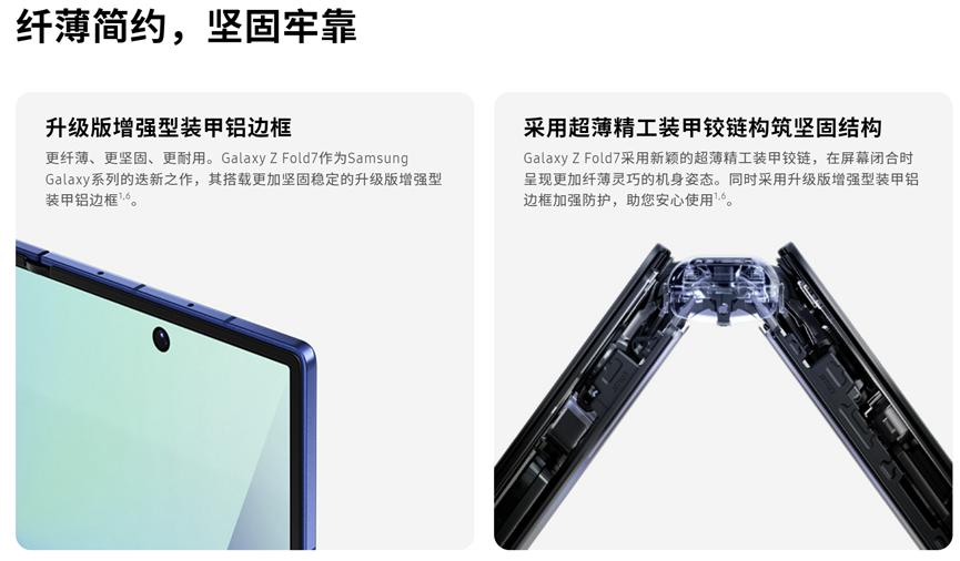 纖薄簡約但堅固牢靠,Galaxy Z Fold7作為Samsung Galaxy系列的迭新之作,搭載更加堅固穩定的升級版增強型裝甲鋁邊框。同時采用新穎的超薄精工裝甲鉸鏈,在屏幕閉合時呈現更加纖薄靈巧的機身姿態。