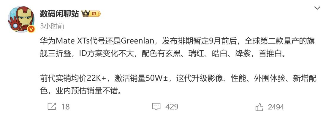 博主@數碼閑聊站 表示,華為首款折疊屏手機Mate XT 實銷均價 2.2 萬元以上,激活銷量在 50 萬部左右,而新一代的Mate XTs 在影像、性能、外圍體驗等方面都進行了升級,而且還有新配色,預估銷量會更高。