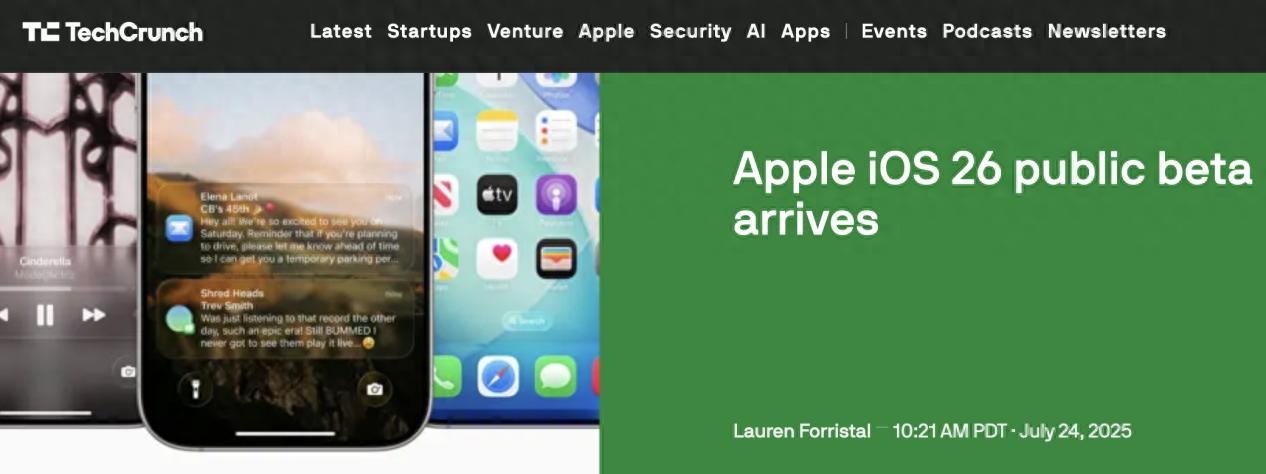 7月25日消息,據techcrunch報道稱,蘋果公司今日面向全球用戶發布 iOS 26 首個公開測試版,并同步推出 iPadOS 26、macOS 26、watchOS 26 與 tvOS 26 的對應版本。此次更新被蘋果稱為“自 iOS 7 以來最大視覺革新”,帶來全新“液態玻璃”設計語言,并全面增強 AI 功能。