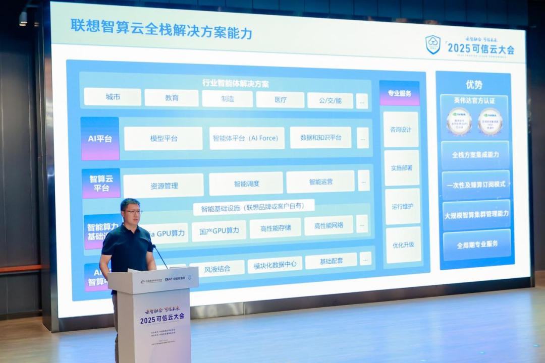 同時,由中國信通院牽頭制定,聯想作為主要參編單位的《大規模智算集群服務部署交付能力要求(第一部分:集成與交付)》行業標準正式發布。 并成功入選2024-2025年度可信云服務典型實踐(能源行業)與醫療行業用戶典型實踐”兩項成果。