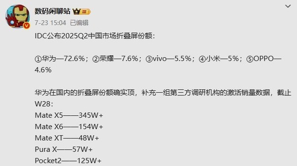 近日,數(shù)碼博主披露的激活量數(shù)據(jù)顯示,華為五大折疊屏手機(jī)表現(xiàn)強(qiáng)勢(shì)。截至2025年第28周,華為Mate X5累計(jì)激活量突破345萬(wàn)臺(tái),Mate X6達(dá)154萬(wàn)臺(tái),Pocket 2為125萬(wàn)臺(tái),Pura X達(dá)57萬(wàn)臺(tái),而全球首款三折疊屏手機(jī)Mate XT 非凡大師激活量超過(guò)48萬(wàn)臺(tái)。