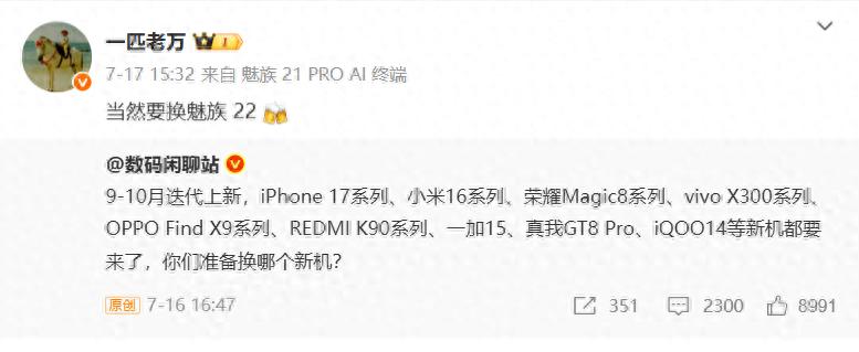 不久前,萬志強在轉發博主數碼閑聊站的新機爆料和網友時互動表示 “當然要換魅族 22”,引發了網友對魅族22 系列是否會延期至 9 - 10 月發布的猜測。機哥覺得,魅族22系列大概率不會選擇在9月份發布。畢竟9月份,各大品牌年度旗艦陸續登場,將會為魅族22系列平添了不少對手。