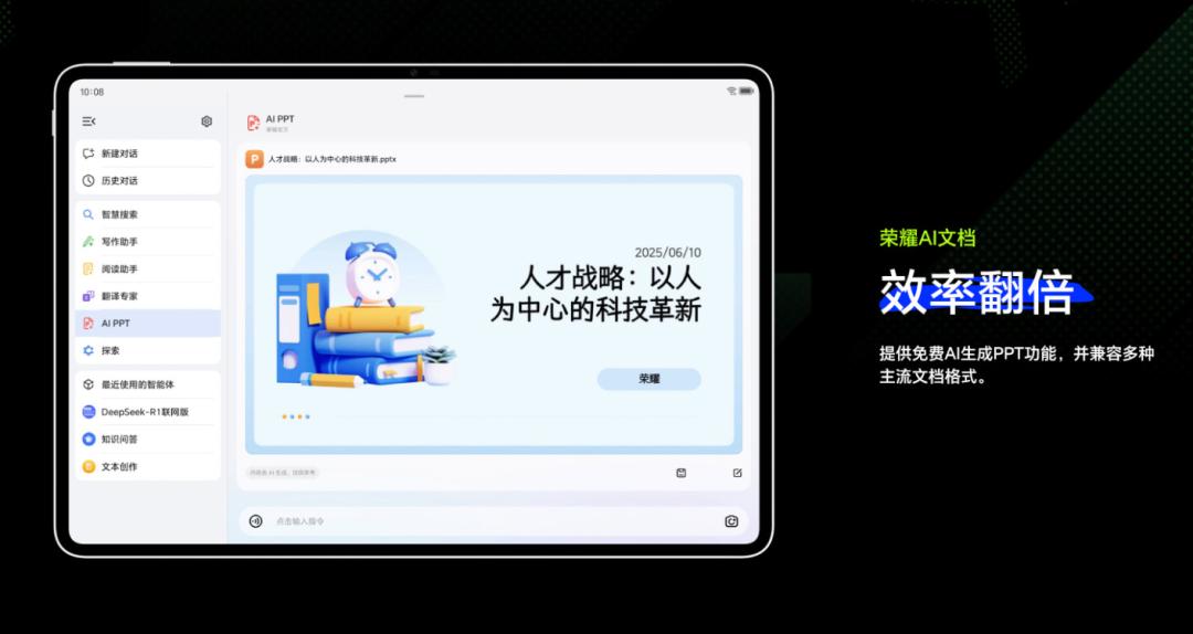 榮耀AI文檔:亮點是支持“免費AI生成PPT”,幫你快速搞定演示文稿。