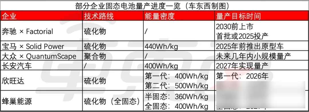奔馳研發主管說量產車可能在2030年前上市,但最近又改口說2025年說不定就能出。其實不止奔馳,歐洲的寶馬大眾,中國的長安、欣旺達這些公司都在搞固態電池。寧德時代電池密度做到500Wh/kg,說2027年能量產,比亞迪和清陶能源也做到差不多水平。
