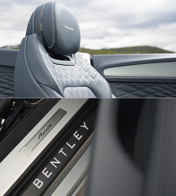 此外,「Azure」車型的座椅與車門飾板還采用了 3D 舒適風格菱形織法,并于座椅頭枕和迎賓門檻飾板點綴有「Azure」標志、座椅甚至擁有能讓駕駛與乘客在冬陽下舒適開篷巡航的頸部加熱功能。