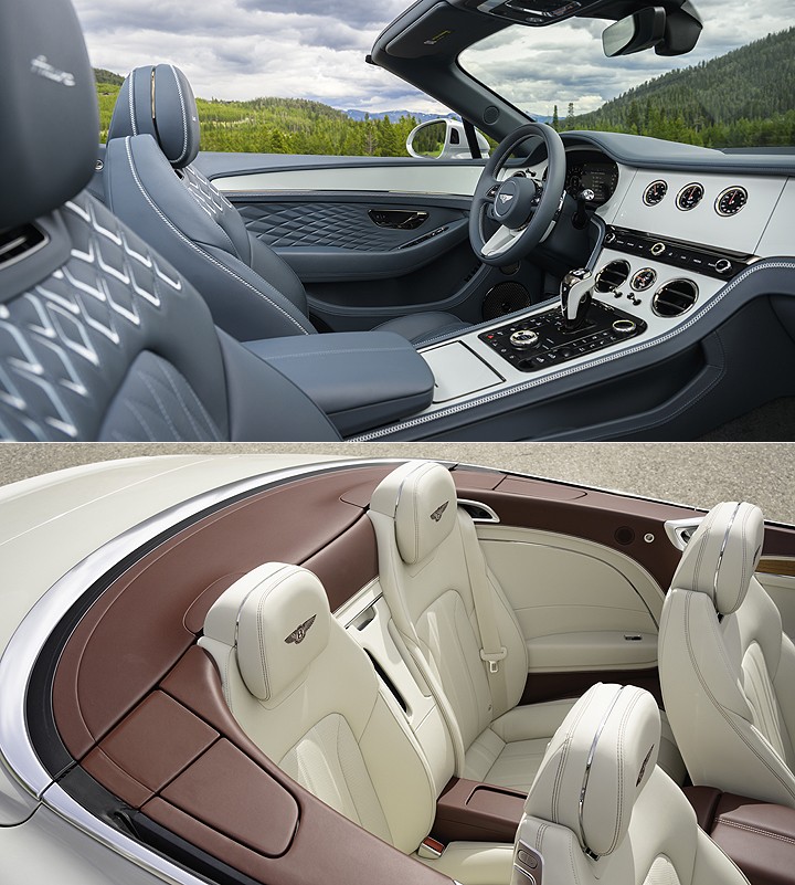 打開僅需 19 秒 (可在時速 48 公里以內行進間作動) 便可完成開篷或關篷的電動軟頂后,Continental GTC 與 Continental GTC Azure 的 2+2 布局座艙內,除了一樣配備了全數位的儀表板,也搭載了沿用自前代車型的三面翻轉中控面板 (Bentley Rotating Display),能分別呈現 12.3 吋高分辨率顯示屏、附三枚指針的模擬表盤與整塊手工飾面。
