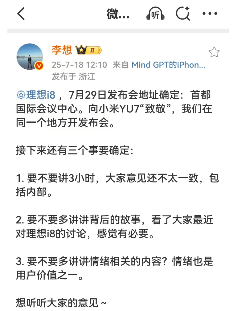 CEO李想日前在社交媒體上宣布i8的發布地址定于國家會議中心——向小米YU7“致敬”,他也想聽聽大家的意見。