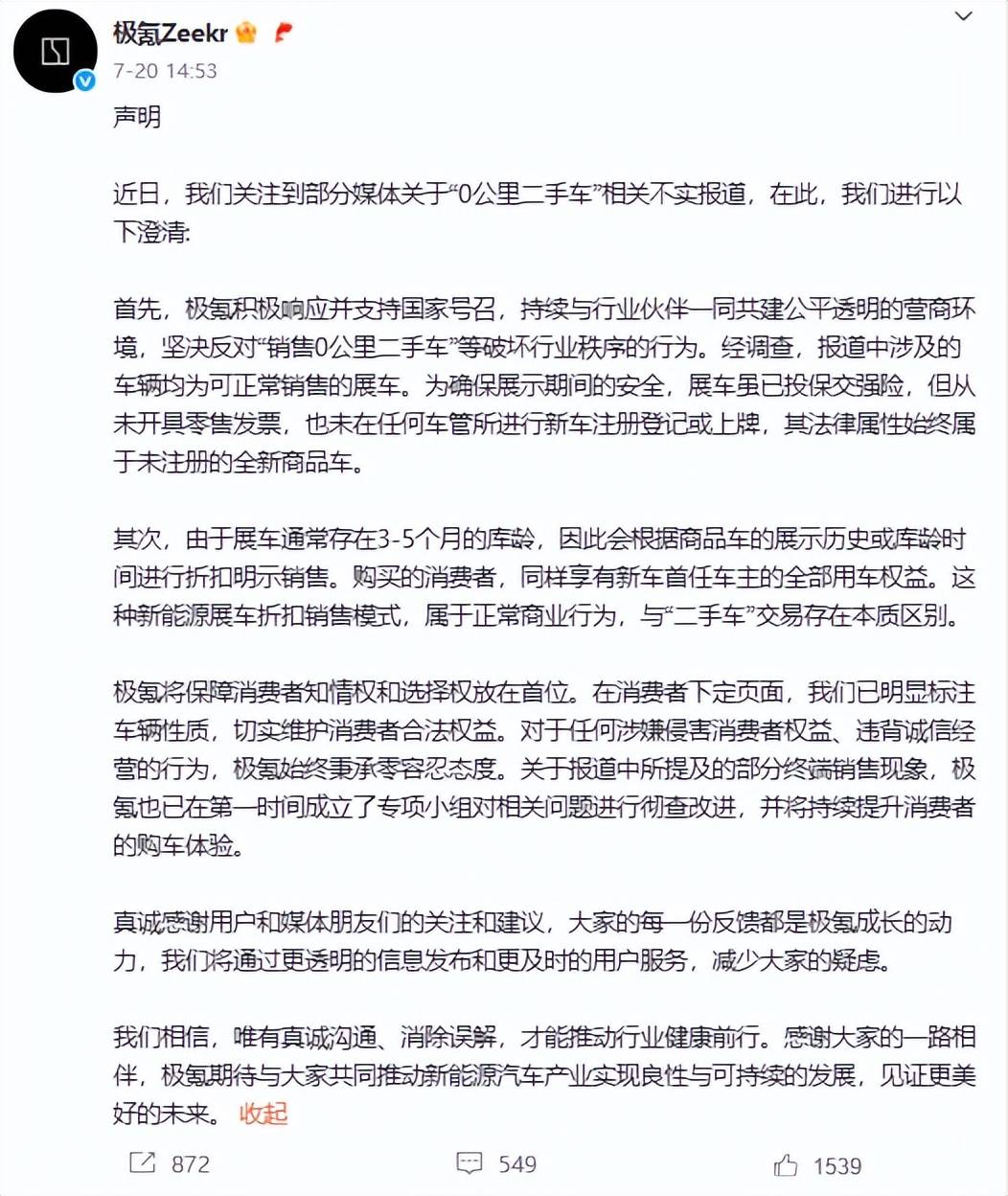 面對洶涌的輿論,極氪在7月20日發布聲明作出回應,核心觀點集中在三個層面:
