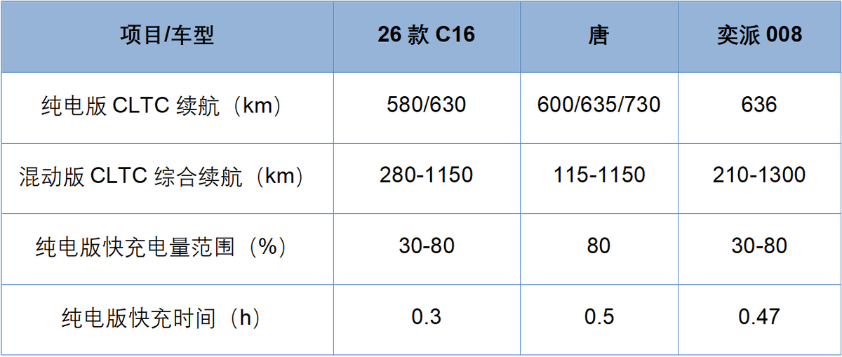 作為各自家族的“拳頭產品”,主機廠都用上了自家的核心技術。比如26款C16純電版采用了800V碳化硅高壓平臺,CLTC續航(標準下同)進一步提升至630km,驅動電機功率進一步提升至220kW,耐力和爆發力都更強;而增程版CLTC純電續航(標準下同)增加到280km,使得綜合續航來到1150km;同時直流快充30%至80%的時間縮短至19分鐘,跑得更遠,補得更快。唐純電版續航有三個“段位”,分別是600km、635km、730km,而插混版純電續航只有115km,綜合續航則同樣為1150km;奕派008純電版續航636km,增程版純電續航為210km,綜合續航達到了1300km。可以看出,三款車純電版本主打續航都在630km左右,滿足日常使用一般不成問題,但快充效率上,26款C16更快;而混動版續航也都超過了1100km,更適合長途出行。當前正值暑假期間,也是一年當中自駕游玩最頻繁、最合適的時節,在續航和補能效率上做文章,使得遠途耐力更好,補能效率更高,這是有的放矢的做法。