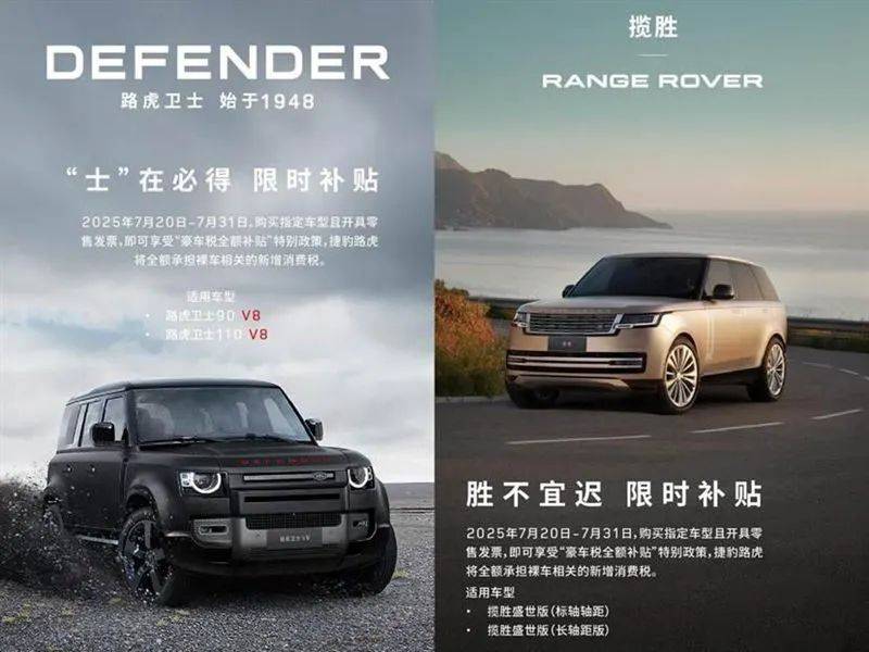 幾乎同一時間,7月20日捷豹路虎成為首家推出“豪車稅全額補貼”政策的車企,該政策規定在2025年7月20日至7月31日期間,消費者購買指定車型且開具零售發票,即可享受捷豹路虎全額承擔裸車相關的新增消費稅的優惠。