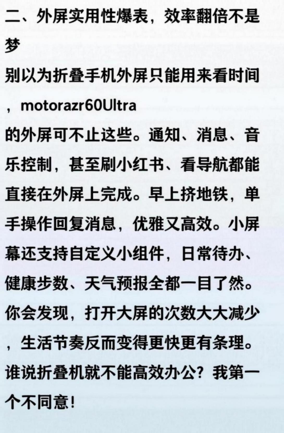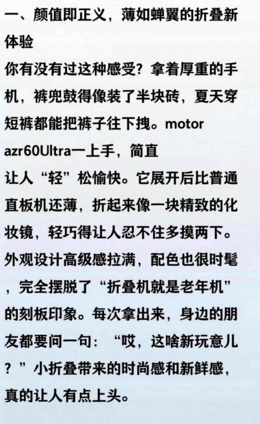 以前總覺得小折疊手機只是個“玩具”,但當我用motorazr60Ultra當主力機一個月后,才發現它是真的香。輕薄、好看、隨手一折就能塞進褲兜,地鐵、咖啡館拿出來,回頭率賊高。更重要的是,日常用它刷劇、拍照、辦公完全沒問題,續航也意外地扛打。現在再讓我回去用大板磚,真有點不舍得了。