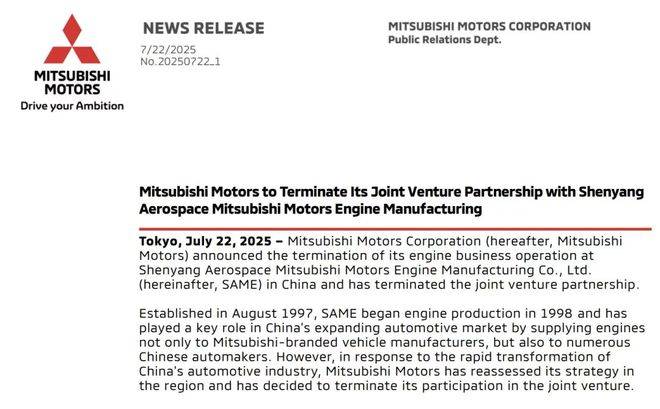7月22日,三菱汽車宣布終止和沈陽航天三菱汽車發動機制造有限公司的合資合作,以及合資公司的發動機業務運營。這也意味著,從整車生產到核心發動機業務,三菱汽車在華的生產版圖徹底清零,三菱汽車將完全退出中國汽車相關生產業務。