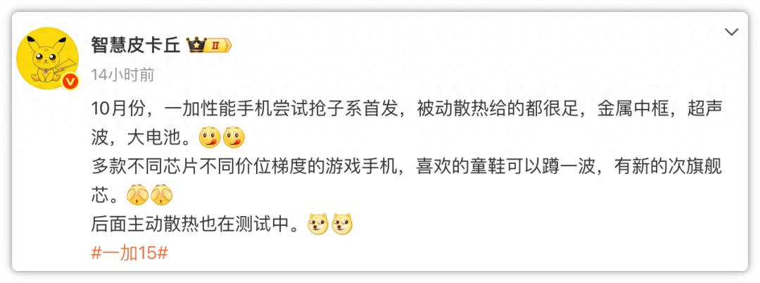 7月26日,智慧皮卡丘發帖稱:“10月份,一加性能手機嘗試搶子系首發,被動散熱給的都很足,金屬中框、超聲波、大電池。多款不同芯片不同價位梯度的游戲手機,喜歡的童鞋可以蹲一波,有新的次旗艦芯。后面主動散熱也在測試中。”