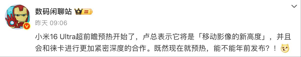 此外有博主發(fā)文稱,小米 16 Ultra 既然現(xiàn)在就開始預(yù)熱,不知道會(huì)不會(huì)在年前發(fā)布,另外盧總表示,這將是“移動(dòng)影像的新高度”,并且會(huì)和徠卡進(jìn)行更加緊密合作。