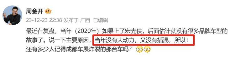 不過,后面的事情想必大家也都知道了,那臺宏光俠并沒有能夠真正量產。至于未能量產的原因,據當時五菱的高管周鈃在之后表示:主要原因是因為當年五菱沒有大動力、又沒有插混,所以關于宏光俠的量產計劃便給擱置了。