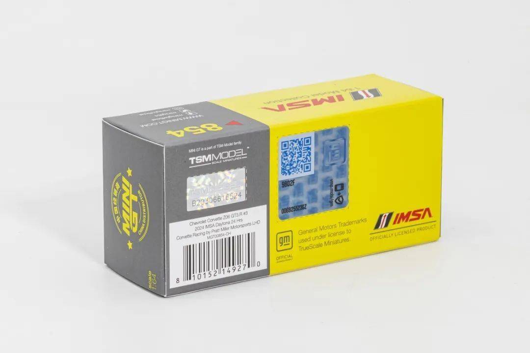產品的包裝就不再累贅了,MINI GT標準風格;黃色(車身同色)+深灰色紙盒有通用和IMSA賽事雙授權,產品的編號是854;紙盒內部是吸塑支撐,模型的車外后視鏡雖然是軟膠的,不怕碰掉。