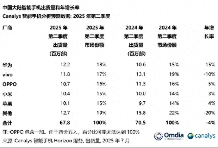 從具體品牌表現來看,華為在本季度以1220萬臺的出貨量重返市場第一的位置,占據18%的市場份額。vivo緊隨其后,出貨量1180萬臺,市場份額為17%。OPPO(含一加品牌)以1070萬臺的出貨量位列第三,市場占比16%。