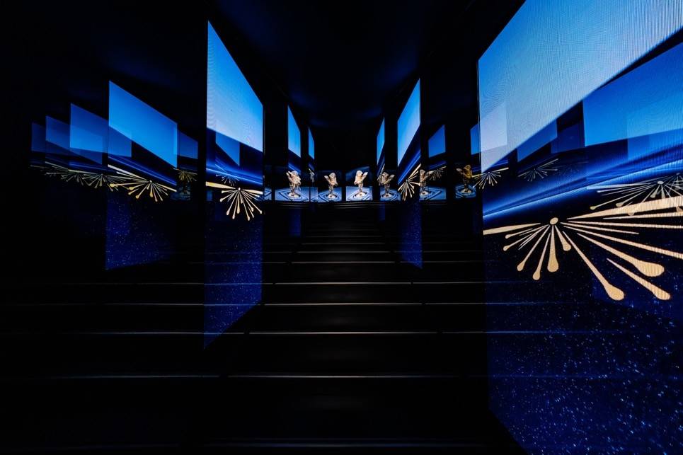 在靈感探索之旅的尾聲,光影躍升于“時空棱鏡”階梯兩側。拾級而上,巧思妙意與至臻匠藝無限延伸,所達之處是歡慶女神“力臻完美”的優雅輝光。