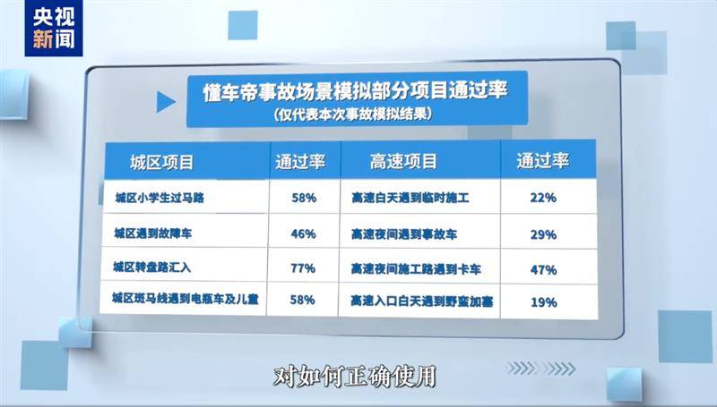 分測試項目來看,在高速項目中,受測車型白天遇到臨時施工、夜間遇到事故車、施工路遇卡車、高速口遇野蠻加塞的通過率分別為22%、29%、47%、19%;而城區項目中,小學生過馬路、遇到故障車、轉盤路匯入、斑馬線遇電瓶車及兒童,通過率分別為58%、46%、77%、58%。
